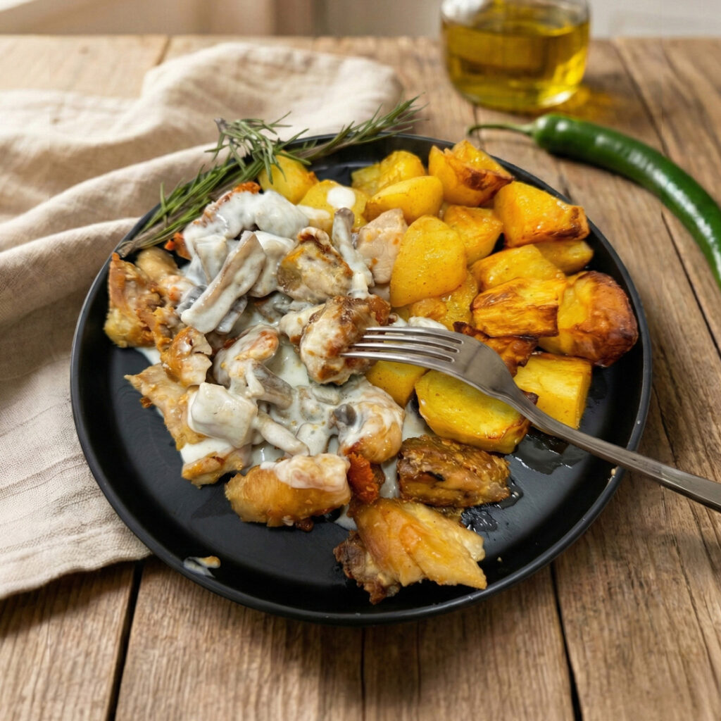 Pui cu ciuperci, smântână și cartofi la cuptor