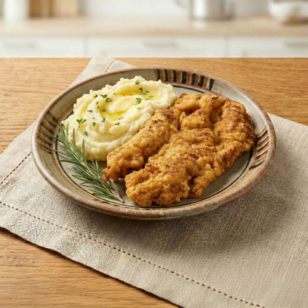 Cotlet de porc, ou, pesmet, cartofi, unt, salată, sare, piper