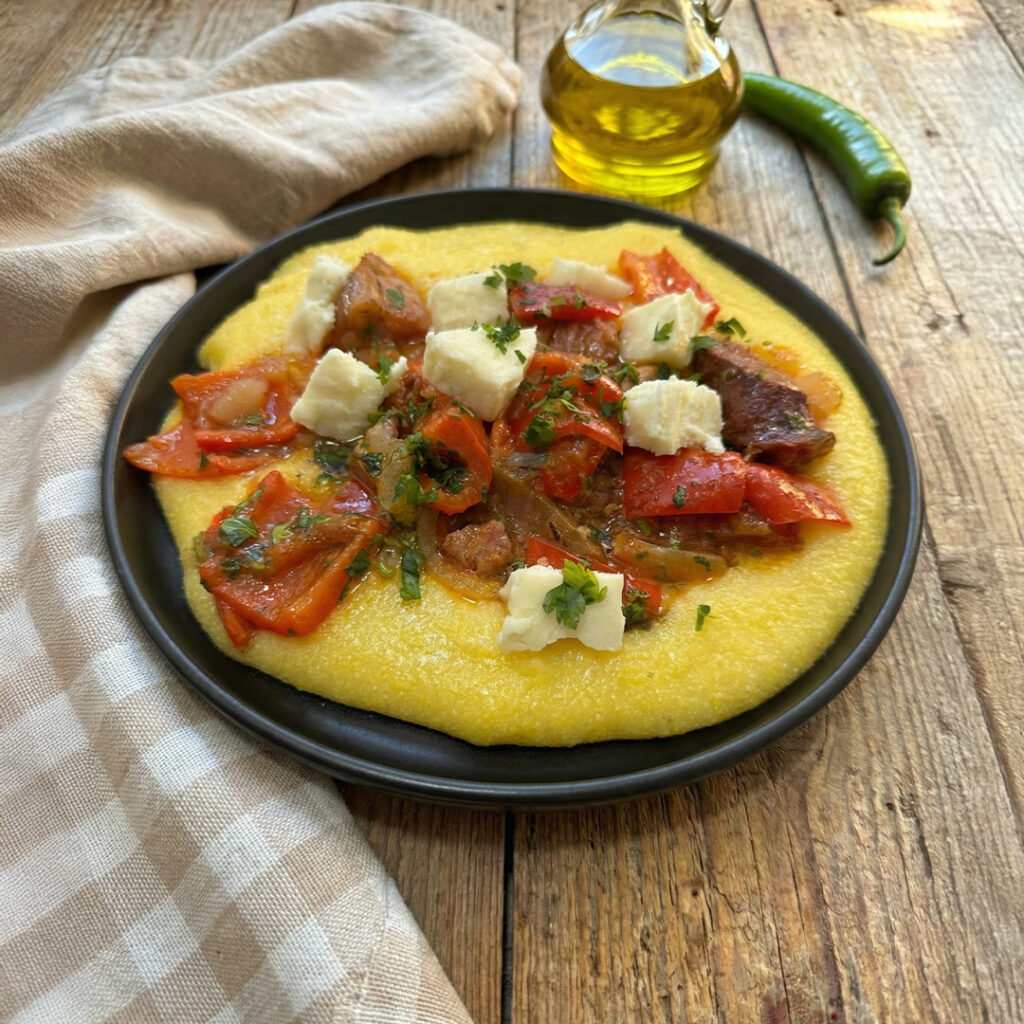 Tocaniță de ardei kapia cu bacon și cârnați pe pat de mămăligă cu brânză de burduf și salată